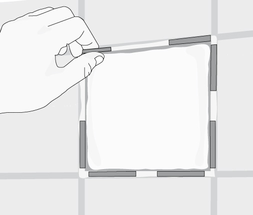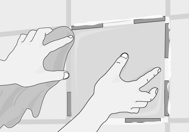 La nueva cerámica se debe asentar muy bien en el adhesivo, moverla hacia los lados para conseguir que el adhesivo se reparta por todos lados.