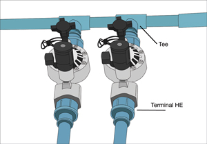 A cada válvula se le unen 2 terminales HE, en uno irá la tubería para su circuito y en el otro irá una Tee que conecte las tuberías con el resto de las válvulas.