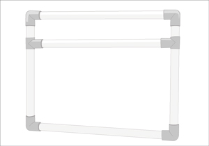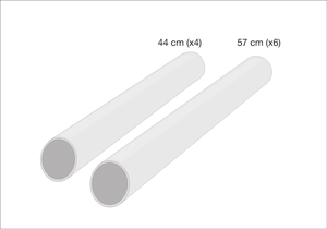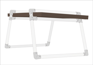 Para los soportes hay que armar un rectángulo con los cortes de Alusystem y ubicar un travesaño en la parte superior que estructure la cubierta de la mesa. Para ello necesitamos dos trozos de 57 cm que deben ubicarse en la parte superior e inferior del rectángulo y finalizar cada extremo con un codo. Para los laterales, incorporar entre los codos 2 trozos de 44 cm, los que deben llevar, sin fijar, las Tees hacia dentro, para incorporar el travesaño que sostendrá la cubierta. Para ubicar el travesaño, que corresponde a otro trozo de 57 cm, hay que considerar un espacio de 9 cm entre éste y el tubo superior. Repita el mismo procedimiento para la otra base de apoyo.