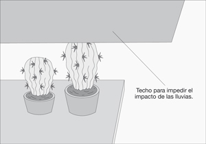 - Se mudan los cactus a lugares donde no reciban el impacto de las lluvias. De estar plantados de modo fijo en un terreno, asegúreles un buen escurrimiento del agua o de otra manera póngales una cubierta encima.