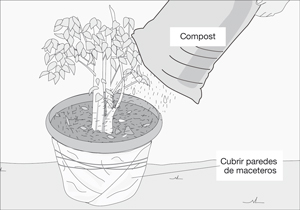 Cuando se anuncien fríos intensos, se protegen las paredes de los maceteros. Una capa gruesa de compost en la superficie resguardará las raíces del intenso frío invernal.