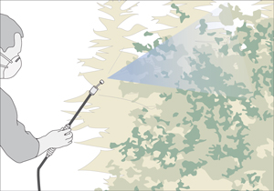 - Pulverizar el producto sobre el follaje de manera uniforme, cubriendo hojas, ramas, tronco e incluso tierra.