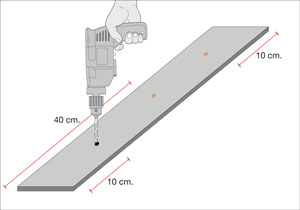 En cada trozo de pletina de 80 cm hacer 3 agujeros con broca para metales. Uno al centro y los otros a 10 cm de los extremos.