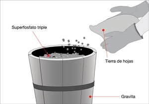 En la base donde irá el pan de raíces echar 1 cucharadita de Superfosfato Triple que ayuda al enraizamiento.