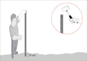 Enterrar 1 pletina de 1,60 cm en la tierra, que quede unos 15 cm enterradas ayudándose con un mazo de goma