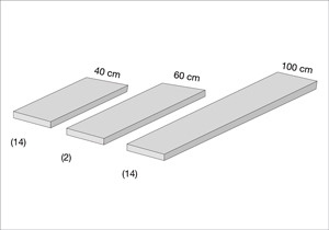 El centro son 2 módulos: el primero que es el más grande se arma con 4 tablas de 100 cm y 2 de 40 cm, y el más pequeño con 2 cortes de 60 cm y 4 cortes de 40 cm. Ambos módulos se unen con dos tablas de 100 cm. Las uniones se hacen con tornillos de 3” y cola fría.