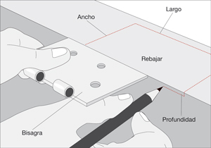 Se usa la bisagra o el contrafrontal como guía para marcar el perímetro y la profundidad del rebaje.