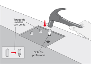 Agregar cola fría profesional en la punta del tarugo y embuta martillando suavemente en los orificios.