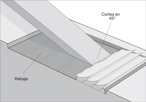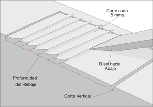Se hacen una serie de cortes paralelos a 5 milímetros de distancia entre ellos con el formón a 45º de la superficie y el bisel hacia abajo