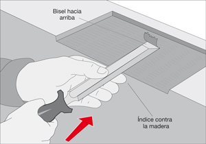 Se saca la madera sobrante con el bisel del formón hacia abajo. Se sostiene el formón en un ángulo bajo, casi paralelo a la superficie. Se usa la presión de la mano sólo para controlar el corte.