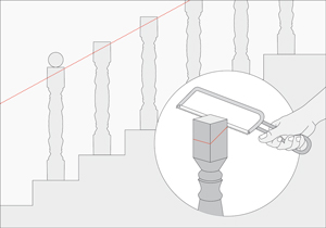 Marcar la base de los balaustros en los peldaños, esto es a 3 cm de ambos bordes del peldaño, siempre fijándose que quede centrado y en la misma línea del pilar de inicio, para que la baranda se pueda apoyar.