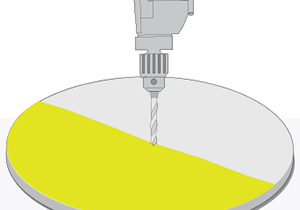 Hacer una perforación con broca para madera de 6 mm y taladro inalámbrico. El agujero se debe hacer en el centro del círculo para que pase el eje de las agujas.