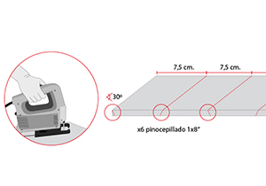 Con la sierra caladora cortar 6 trozos de pino cepillado 1x8” con un largo de 7,5 cm. La sierra caladora tiene una base de la hoja que se puede inclinar en diferentes ángulos, para así poder cortar con distintos grados de inclinación En este caso serán 30º.