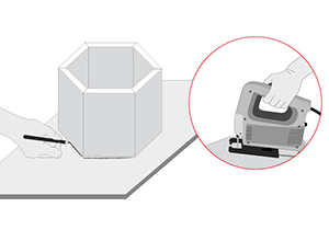 Para obtener el molde perfecto para las tapas lo mejor es usar el hexágono, y copiar su contorno en una madera, dos veces para tener la trasera y el frente. Cortar con la sierra caladora.