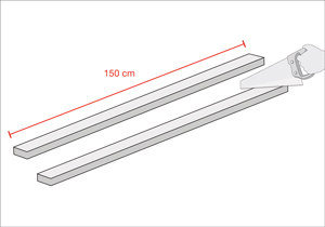 Para cada tutor se necesitan 2 vigas de pino cepillado de 2x4”, la altura dependerá del muro donde será apoyado. En este caso miden 150 cm. Se pueden cortar con serrucho o sierra circular.