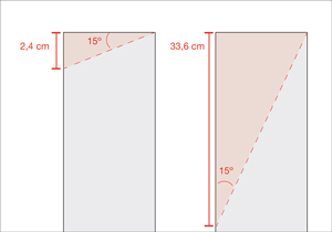 A cada trozo de madera hay que hacerles unos cortes en ángulo de 15° en cada extremo para que se puedan apoyar al muro y suelo. Para lograr la inclinación de 15°, en el extremo inferior hay que cortar 2,4 cm desde uno de los bordes; y en el extremo superior hay que cortar desde la esquina 33,6 cm hacia arriba en diagonal.