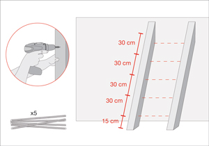 Los 2 pilares de cada tutor serán unidos con hilos zincado que miden 1 mt de largo, la cantidad de hilos dependerá del largo del muro, en este caso usaremos 5, considerando que una correcta distancia entre cada uno no debe superar los 30 cm. Hay que hacer perforaciones cada 30 cm con broca paleta de 19 mm para esconder la tuerca, y después terminar el agujero con broca para madera de 7 mm. La distancia del primer hilo es recomendable que sea un poco menor, con 15 cm es suficiente, para que se pueda guiar la enredadera aunque sea pequeña.