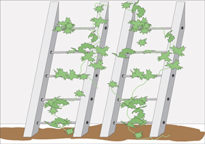Apoyar el tutor en la tierra y en el muro, dejándolo inclinado gracias a sus cortes en 15°. Guiar los tallos de las enredaderas por los hilos, procurando que sirvan para que el follaje no se caiga o se vaya hacia delante.