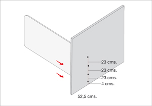En la parte de atrás del respaldo hacer mediciones para fijar la pieza divisoria. Desde el borde izquierdo (mirando el respaldo desde atrás) medir 52,5 cms. En esa línea el primer agujero va a 4 cms desde el suelo y los 3 restantes a 23 cms entre sus ejes. Por el frente de la trasera poner la pieza divisoria para hacerla calzar con las marcas y atornillarla.