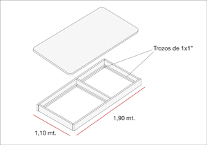 La base de la cama tiene que tener un marco que la levante del piso y le dé rigidez. Este marco se hace formando un rectángulo de 1,90 x 1,10 mt con las tablas de 4x1”. Se necesitan 2 trozos de 1,90 mt y 3 de 1,06 mt. Se fijan con tornillo para madera. Para reforzar el centro se pone una tercera tabla de 1,06 mt, justo a la mitad. Dentro de este marco atornillar trozos de 1x1”, son 4 de 92 y 4 más de 1,02 mt. Ellos darán superficie de fijación para la base de la cama y permitirán, posteriormente, atornillar las ruedas.