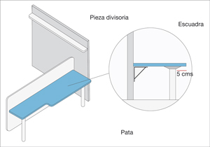 Fijar con tornillos 2 patas, una en cada extremo, a 5 cms desde la esquina. Para fijar el escritorio al respaldo poner 4 escuadras con travesaño.
