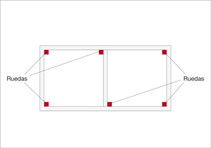 Fijar 6 ruedas: 2 ruedas por extremo y al centro, puestas en forma intercaladas, una a cada lado de la tabla del centro. En cada lugar donde van las ruedas fijar un trozo de madera de 10x10 cms y sobre él atornillar las ruedas.