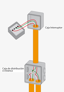 Cable fase (rojo, negro o azul): hacia la caja de distribución, desde la caja al terminal del interruptor, desde el segundo terminal hacia la caja de abajo, y desde la caja hacia el foco de plástico o la caja siguiente. Cable Neutro (blanco o café): a la caja de distribución, desde la caja hacia el foco o hacia la siguiente caja.