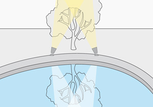 Esta es una forma espectacular para reflejar objetos grandes, por ejemplo un árbol contra el agua formando el efecto de un espejo. Para crear este efecto, elegir un objeto de gran tamaño (un árbol, por ejemplo) que esté detrás del agua pero totalmente a la vista. Iluminar el objeto de abajo hacia arriba cuidando de no iluminar el agua ya que para alcanzar el efecto ésta debe estar más bien oscura.