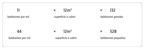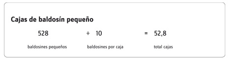 Sabiendo la cantidad de unidades que se necesitan, podremos calcular cuántas cajas de cada tipo de cerámica necesitamos. Así, si en una caja vienen 10 palmetas, debemos dividir la cantidad de unidades necesitadas en total, por la cantidad de palmetas que vienen en una caja: