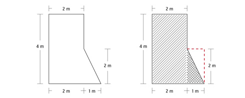 Espacio compuesto por más de una figura simple, y con diagonales. Si no podemos identificar figuras simples, podemos proyectarlas para así completar una figura que nos sea más familiar y resulte más fácil de calcular.