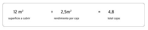 Si queremos instalar cerámicas con todas las palmetas de igual tamaño, debemos dividir el total de metros de la superficie que queremos cubrir, por el rendimiento indicado en la etiqueta para saber cuántas cajas necesitamos. Así, si la cerámica a instalar se vende en cajas que tienen un rendimiento de 2,5 m2, lo calculamos de la siguiente manera: