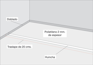 - Poner el polietileno de muro a muro. Los pliegos deben traslaparse unos 20 cm. y sellarse con cinta de embalaje.