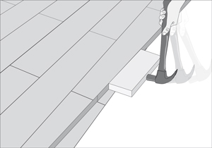 - Se necesita un bloque de impacto para martillar sobre el panel sin que el impacto dañe la ranura ni la madera. Puede ser un pedazo cortado de una de las tablas.