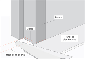 - La forma más común de trabajar los marcos de las puertas es hacerles un corte abajo para dejar un bajorrelieve que permita que el piso flotante se meta por debajo.