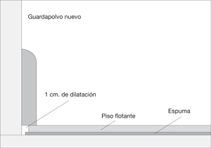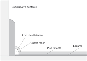 - Es importante dejar 8 a 10 mm. de espacio en todo el perímetro para permitir que el material se expanda libremente. Este es un detalle fundamental para el éxito de la instalación, pues si llega a tocar la pared, aunque sea en sólo un punto, el piso se levantará inevitablemente.
