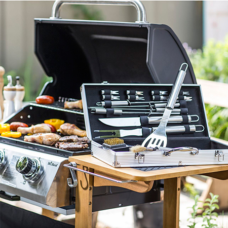 Trabaja con más comodidad con un set de utensilios especiales para asados, que incluyen cuchillos, tenedor, pinzas, espátulas, brochas y tablas de madera.
