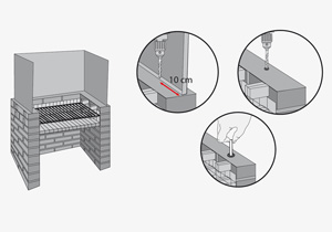 Presentar la base arriba del quincho. Las perforaciones se hacen a 10 cm desde las esquinas. Primero hay que usar la broca para metal para traspasar la base, hacer la marca en el ladrillo del quincho, sacar la base y terminar la perforación con la broca para concreto.