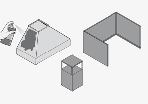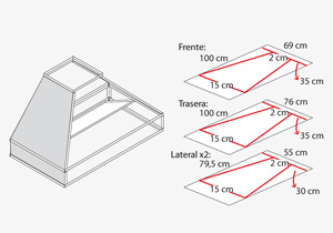 Con la tijera de hojalata cortar el revestimiento de la campana que se compone de 4 trozos de plancha: 2 laterales de 79.5x55, un frente de 100x76 y una trasera de 100x69.