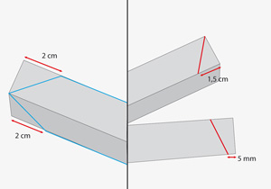 Para armar la forma de la campana, a los trozos de 63,5 y 68,5 cm también hay que hacerles cortes en sus extremos, pero son diagonales distintas en cada uno de sus lados. En los 2 trozos de 68.5 cm uno de sus extremos tiene una forma de flecha marcando 2 cm en cada lado. En el otro extremo se hace una contraflecha, un lado del ángulo se corta con una línea diagonal a 1,5 cm y la otra a 5 mm. Y los 2 trozos de 63,5 cm tienen los 2 extremos en contraflecha y con las mismas medidas de 1,5 cm y 5 mm.