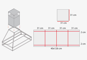 El revestimiento de la chimenea se hace con un trozo de 40x126 cm de plancha metálica, que hay que cortar con la tijera hojalatera. Se dividide en 4 partes de 31 cm y una pestaña de 2 cm para hacer la fijación. El revestimiento no llega hasta arriba de la chimenea, porque va un techo de 31x31 cm para protegerlo de la lluvia, el humo podrá salir por los costados.