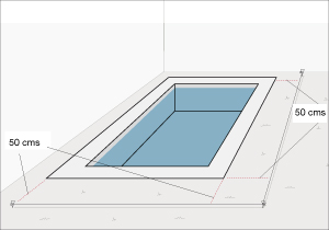 Dejando una separación de 50 cms con el borde la piscina, clavar unas estacas en cada esquina de la piscina para amarrar una lienza que marque el trazado que tendrá la reja.