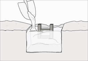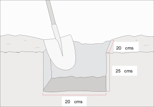 En las marcas de 20x20 cms hacer una excavación de aproximadamente 25 cms de profundidad.