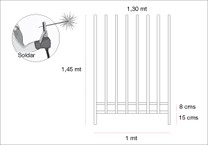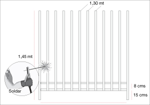 Cada módulo que mide 1 mt necesita 6 fierros de 1,30 mt de largo, 2 de 1,45 mt y otros 2 de 1 mt que irán en forma horizontal. Presentar los 2 fierros de 1,45 mts, dándoles una separación de 1 mt. Poner encima el primer horizontal (mide 1 mt) a 15 cms desde el extremo inferior de los verticales y soldar en los dos encuentros. Poner el segundo horizontal 8 cms más arriba y, también, soldar en los 2 encuentros. Por debajo de los horizontales soldar los 6 fierros verticales que miden 1 mt, dejando una separación entre cada uno de 10 cms. Dar vuelta el módulo y soldar por el otro lado. Esto es necesario para que los encuentros queden bien fijos.