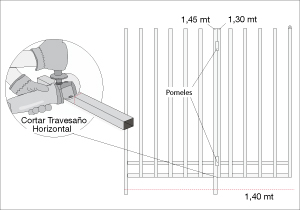 El módulo de la puerta mide 1,40 mt en total, pero se divide en 2 partes. Comenzar igual que los otros módulos, es decir soldando a los fierros horizontales, uno vertical de 1,45 mt de alto. Después soldar 5 verticales más, pero de 1,30 mt separados por 10 cms. El séptimo fierro debe ser de 1,45 mt para poder embutirlo en el pollo hecho especialmente para la puerta. Pegado a él va uno de 1,30 mt y después 5 fierros más, también de 1,30 mt de altura, separados con una distancia de 10 cms. Una vez que están soldados todos los fierros se sueldan, en la juntura del fierro séptimo y octavo, 2 pomeles a una distancia aproximada de 30 cms desde el suelo y del extremo superior. Se da vuelta la estructura y se cortan los fierros horizontales, justo donde van los pomeles, para que la puerta se pueda mover