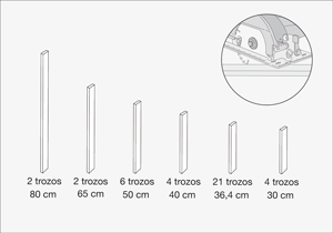 Dimensionar las tablas de pino finger en las siguientes medidas: para la mesa más grande se necesitan 4 trozos de 50cm, 2 de 80cm, y 7 más de 36,4cm para sus travesaños; para la mesa mediana se usan 4 de 40cm, 2 de 65cm y también 7 de 36,4 cm para las cadenetas; y finalmente para la más chica se ocupan 4 de 30cm, 2 de 50cm, más sus 7 travesaños de 36,4 cm