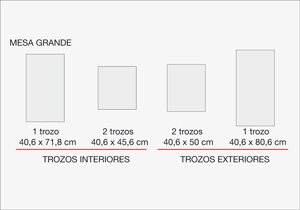 En el servicio de dimensionado o en la casa con una sierra circular se debe cortar las placas de MDF de 3 mm en las siguientes medidas: para la mesa grande se necesita 1 trozo de 40,6 x 71,8cm, 2 de 40,6 x 45,6cm, 2 más 40,6 x 50 cm y un 1 corte de 40,6 x 80,6cm; para la mesa mediana se necesita 1 trozo de 40,6 x 56,8cm, 2 de 40,6 x 35,6cm, 2 más de 40,6 x 40cm, y 1 corte de 40,6 x 65,6cm; y para la mesa más chica se usa 1 trozo de 40,6 x 41,8cm, 2 de 40,6 x 25,6cm, 2 más de 40,6 x 30cm y 1 corte de 40,6 x 50,6cm.