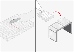 Las tres mesas se arman de la misma manera, con 2 C puestas en forma de corchete, que se unen con los travesaños o cadenetas. Para armar estas C se deben cortar los extremos de pino finger en ángulo de 45º. Esto se hace con la caja de ingletes y el serrucho costilla, preocupándose de sólo hacerlo en 1 de los extremos de las patas y en las 2 puntas del corte horizontal.