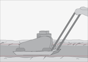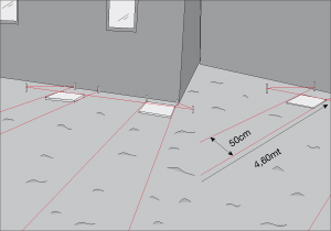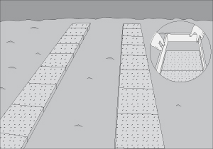 Enterrar estacas de pino cepillado de 2x1” y amarrar lienza de algodón para delimitar el espacio. Para un auto se deben hacer 2 huellas de 50 cm x 4.60 mt de largo (largo se puede modificar según tamaño del espacio y del auto), cada huella se debe separar según el ancho del auto, procurando que las huellas queden a eje de las ruedas. El ancho aproximado de un auto es de 2 mt, pero hay que comprobarlo.