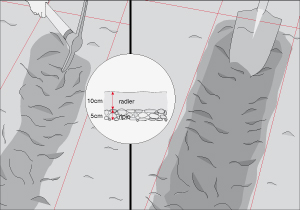 Excavar en las huellas para que los pastelones nos queden a ras, hay que rebajar 15 cm en total, porque se pondrá una capa de ripio de 5 cm y el radier tendrá 10 cm. La lienza sirve como referencia para poder medir la profundidad de la excavación.