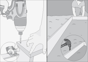 Construir con las tablas de 5x1” los moldajes y ponerlos dentro de las huellas. Hay que cortar los trozos con la sierra circular y fijarlos con tornillos para madera. Por los lados se afirman al terreno con estacas de fierro, cortados a unos 20 cm con esmeril angular. Estas estacas sirven para dejar bien fijo el moldaje y que no se mueva mientras se seca el radier.